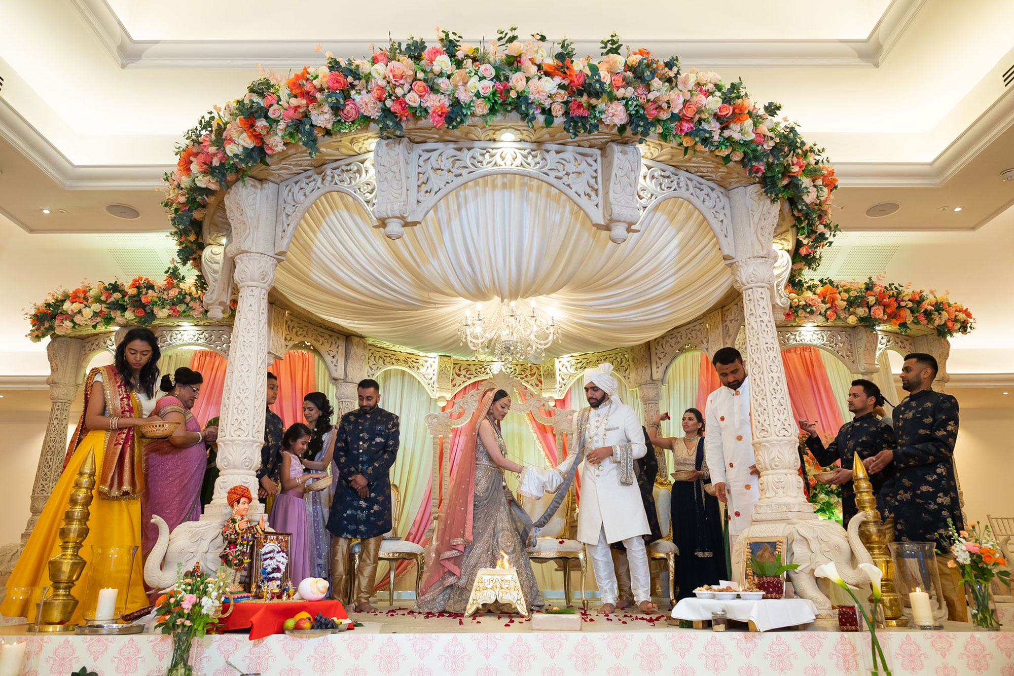 We set this beautiful wooden elephant themed mandap, which was carefully designed by ourselves with expert guidance from our skilled team in India. Intricately carved pedestals leading to a stunning wooden mandap resting on gorgeously designed pillars sat on beautiful elephant bases.